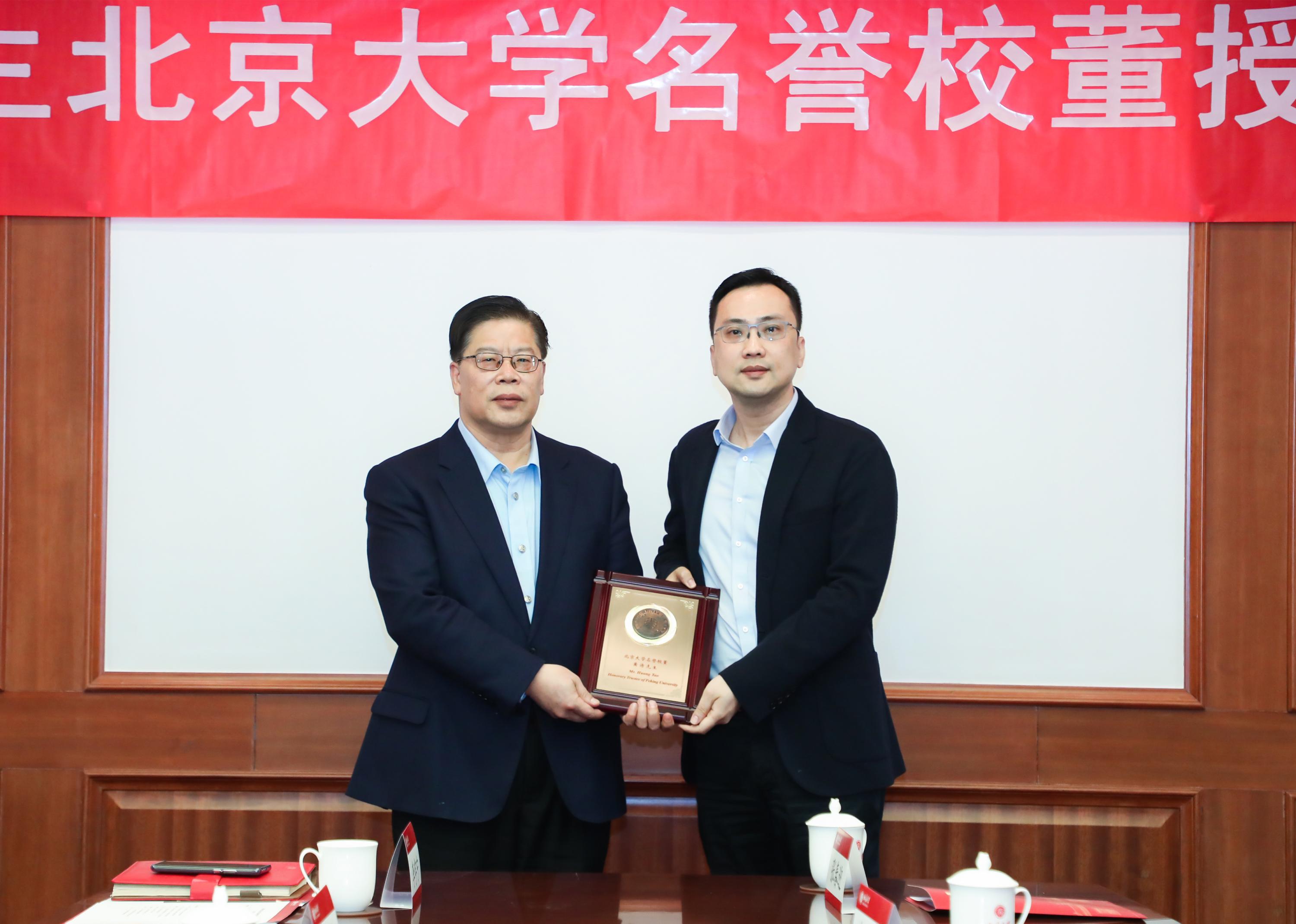 邱水平向黃濤頒授北京大學(xué)名譽(yù)校董銅牌