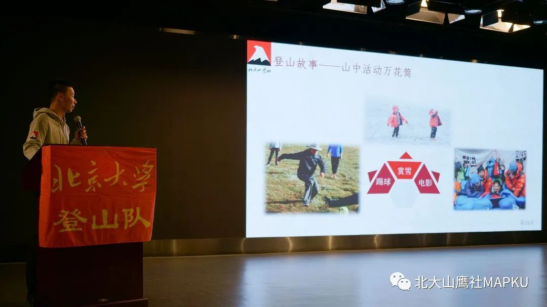 2020年10月16日,北大山鷹社阿尼瑪卿登山隊(duì)舉行報(bào)告會(huì)并首發(fā)登山紀(jì)錄片。在北京大學(xué)新太陽學(xué)生中心“九一劇場(chǎng)”,借助完備的舞臺(tái)設(shè)施和出色的音響效果,北大師生通過震撼人心的視頻和圖片,共同走進(jìn)登山隊(duì)員的“踏雪尋卿”之旅,感受攀登和征服雪山的精神魅力。