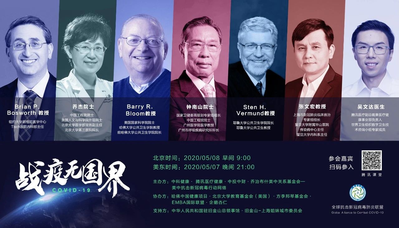 中國工程院院士、國家衛(wèi)健委高級別專家組組長鐘南山,中國工程院院士、美國人文與科學(xué)院外籍院士、北京大學(xué)醫(yī)學(xué)部常務(wù)副主任、北京大學(xué)第三醫(yī)院院長喬杰,上海市新冠肺炎臨床救治專家組組長、復(fù)旦大學(xué)附屬華山醫(yī)院感染科主任張文宏與美國國家科學(xué)院院士、哈佛大學(xué)公共衛(wèi)生學(xué)院前院長巴利?布魯姆(Barry R. Bloom),耶魯大學(xué)公共衛(wèi)生學(xué)院院長斯丹?佛蒙特(Sten H. Vermund),紐約大學(xué)朗格尼醫(yī)學(xué)中心Tisch醫(yī)院醫(yī)學(xué)主任布賴恩?博斯沃思(Brian P. Bosworth)等專家出席了研討會。研討會由騰訊醫(yī)療副總裁吳文達主持。