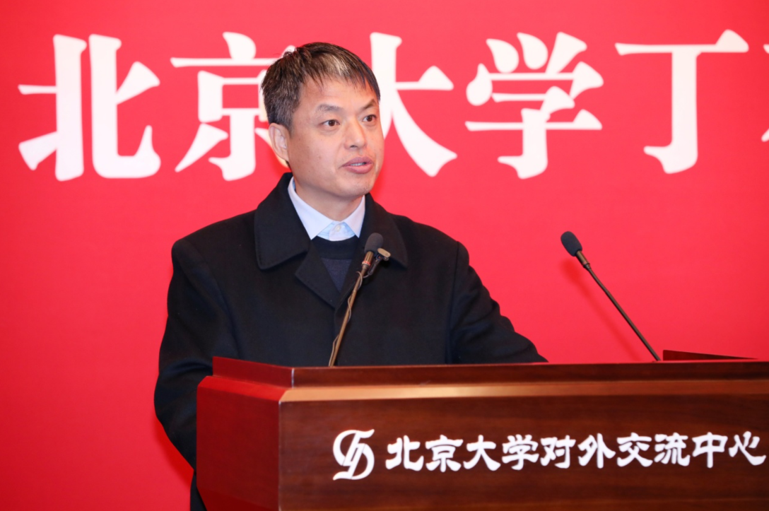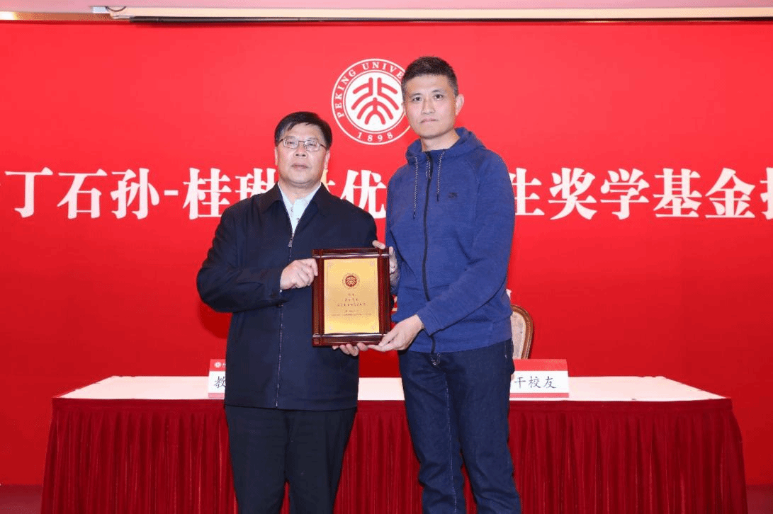 邱水平向丁干校友頒發(fā)北京大學(xué)教育貢獻(xiàn)獎(jiǎng)