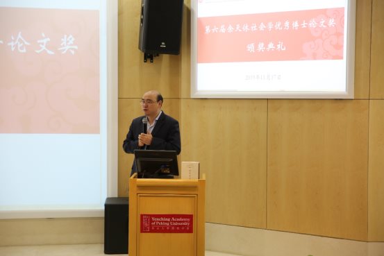 胡俊代表北京大學(xué)余天休社會(huì)學(xué)基金和基金的捐贈(zèng)者胡余錦明女士致辭。他向所有獲獎(jiǎng)?wù)弑硎咀YR,并追溯了胡余錦明女士設(shè)立余天休社會(huì)學(xué)基金的初衷和歷程。胡俊表示,明年將是余天休先生執(zhí)教北大的百周年紀(jì)念,余天休獎(jiǎng)的發(fā)展和對(duì)中國社會(huì)學(xué)的貢獻(xiàn)將是對(duì)其紀(jì)念的重要部分。