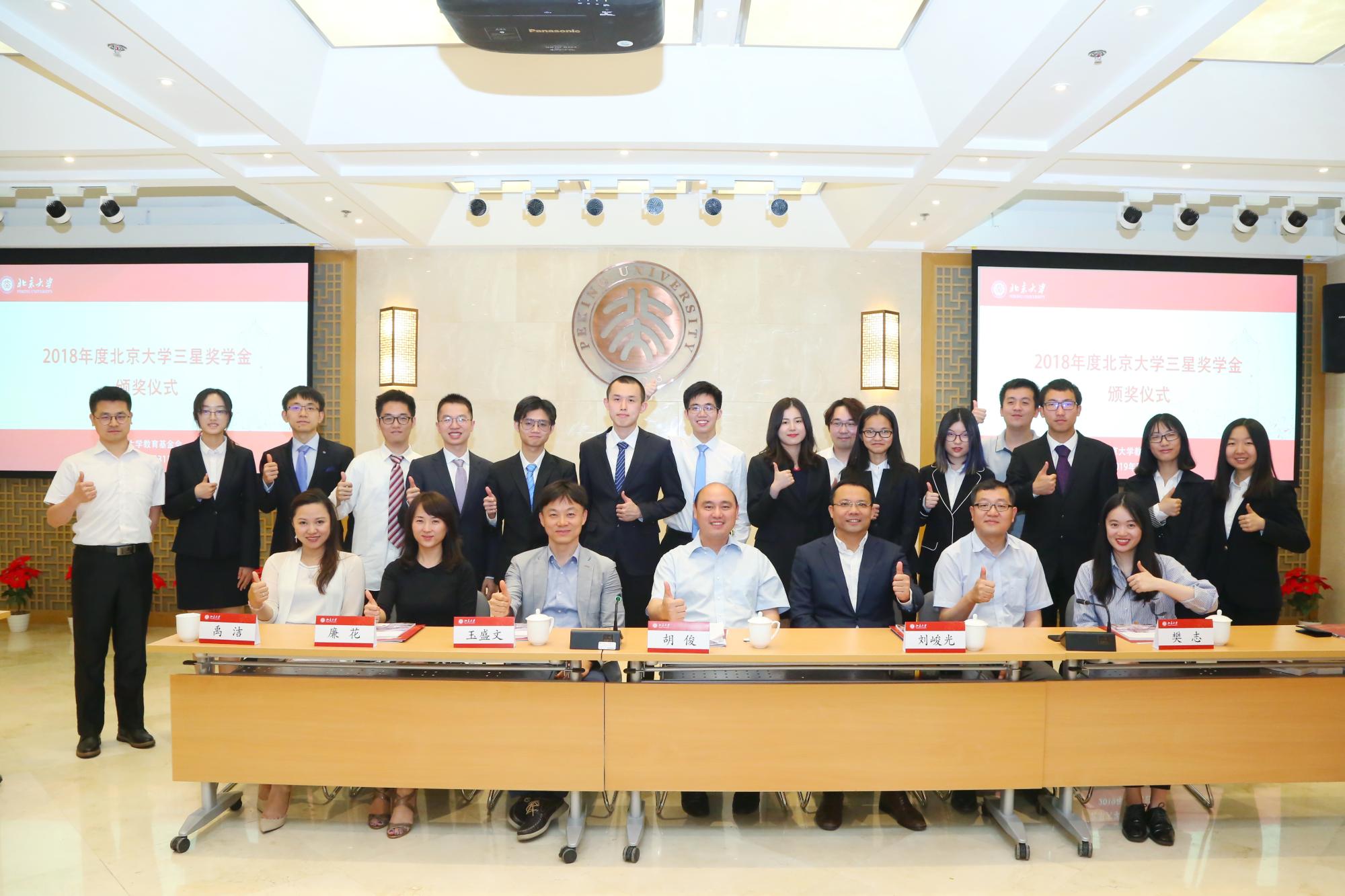 樊志介紹了2017-2018學(xué)年度北京大學(xué)三星獎學(xué)金的評審情況并宣布了獲獎學(xué)生名單。2017-2018學(xué)年度,北大共有17名同學(xué)獲得三星獎學(xué)金,他們不僅學(xué)習(xí)成績優(yōu)異,其它各方面也有非常出色的表現(xiàn),是北大學(xué)生中的佼佼者。隨后,與會嘉賓和領(lǐng)導(dǎo)共同為獲獎學(xué)生頒發(fā)獲獎證書及禮品。