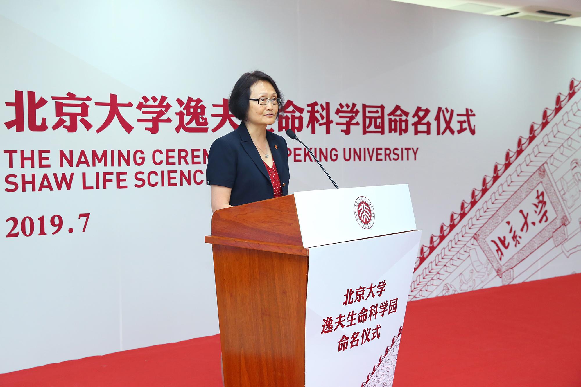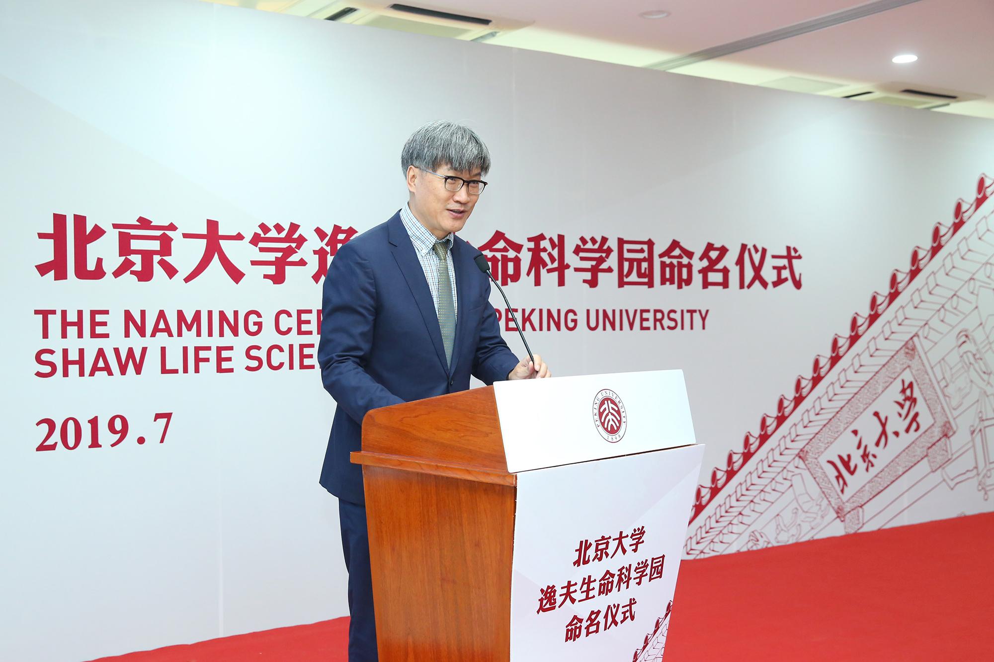 王博代表學(xué)校感謝邵氏基金會對北大的信任與厚愛、對生命科學(xué)的持續(xù)支持,也感謝教育部多年來給予北大的認(rèn)可與支持。王博指出,作為新的學(xué)術(shù)園地,逸夫生命科學(xué)園是北大規(guī)模最大、最前沿的生命科學(xué)教學(xué)研究基地,未來將創(chuàng)造出最優(yōu)秀的科研成果。王博提到,邵逸夫先生曾說過,人類的偉大在于追求、研究、傳授學(xué)問、造福人類。他表示,這也是北大的學(xué)術(shù)理想與使命,北大將建設(shè)好包括生命科學(xué)在內(nèi)的各類學(xué)科,繼續(xù)關(guān)心人類所面臨的重大問題,為實現(xiàn)中華民族偉大復(fù)興努力前行、貢獻力量。