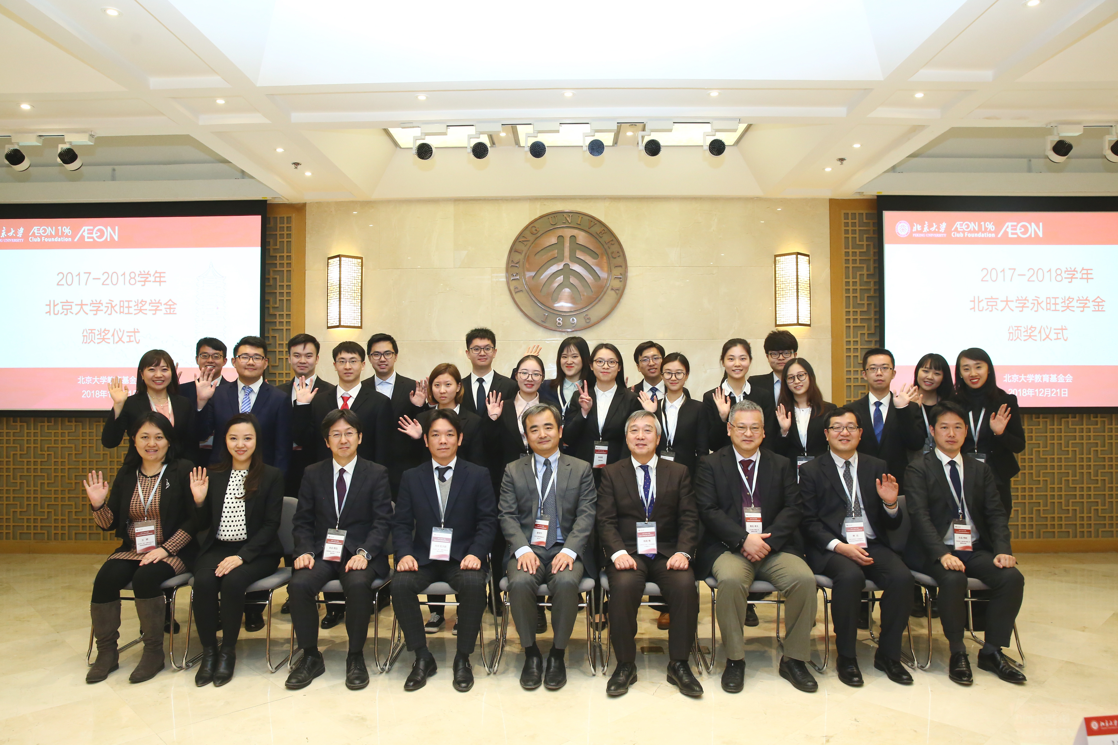 12月21日,2017-2018學(xué)年度北京大學(xué)永旺獎(jiǎng)學(xué)金頒獎(jiǎng)儀式在教育基金會(huì)北大之友報(bào)告廳舉行。公益財(cái)團(tuán)法人永旺1%俱樂(lè)部理事長(zhǎng)兼永旺集團(tuán)議長(zhǎng)橫尾博、永旺商業(yè)有限公司董事總經(jīng)理椎名孝夫、天津永旺小額貸款有限公司董事總經(jīng)理永島秀樹、永旺幻想(中國(guó))兒童游樂(lè)有限公司董事長(zhǎng)兼總經(jīng)理池田宏次郎、公益財(cái)團(tuán)法人永旺1%俱樂(lè)部事務(wù)局長(zhǎng)本田陽(yáng)生等蒞臨燕園,與北京大學(xué)教育基金會(huì)秘書長(zhǎng)李宇寧,學(xué)生工作部副部長(zhǎng)、學(xué)生獎(jiǎng)勵(lì)獎(jiǎng)學(xué)金評(píng)審委員會(huì)秘書長(zhǎng)樊志和獲獎(jiǎng)學(xué)生共同出席活動(dòng)。頒獎(jiǎng)儀式由教育基金會(huì)項(xiàng)目部部長(zhǎng)禹潔主持。
