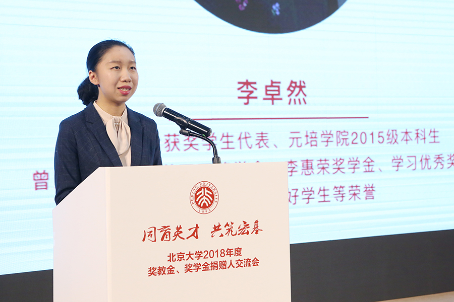 方正獎學金獲獎者、元培學院2015級本科生李卓然感謝各位捐贈方的關懷與支持讓獲獎學生擁有極大的勇氣與自由在自己所熱愛的領域積極探索、奮勇前行。她認為正是這些無私而溫暖的鼓勵與支持讓他們這些“基因”通過大學的學習表達出自己所承載的蛋白,擁有為社會做出貢獻的才智與能力。李卓然表示,每一份善意都會被銘記與傳承,他們將秉承“修身、齊家、治國、平天下”的信念,承擔起對國家、對社會的責任,努力為人類的發(fā)展與進步,注入新鮮的血液與活力。