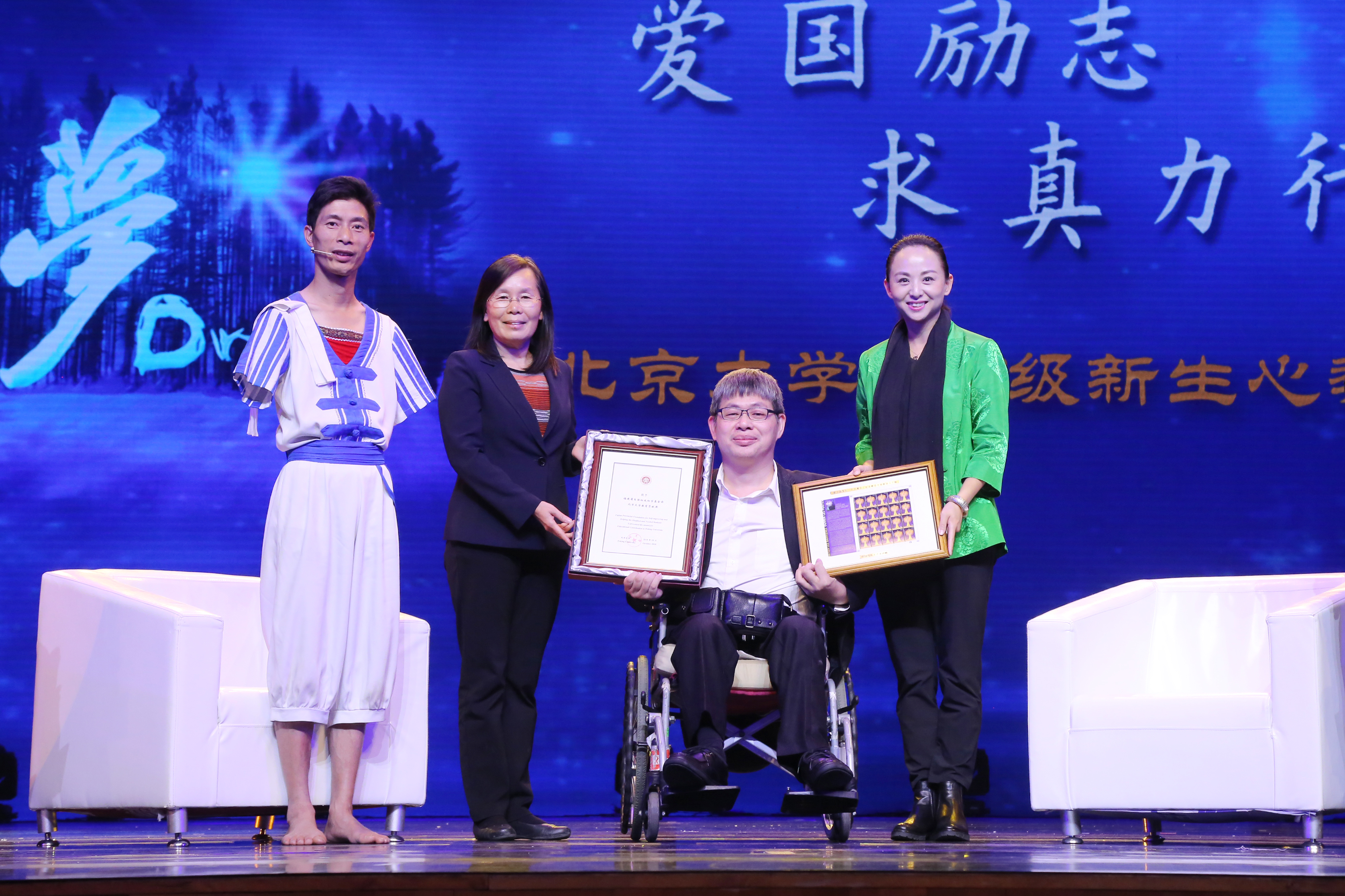 10月14日晚,“愛國、勵志、求真、力行”北京大學(xué)2018級新生心教育晚會在北京大學(xué)百周年紀念講堂舉行。中國殘聯(lián)副主席呂世明,北京大學(xué)黨委副書記、紀委書記葉靜漪,新東方教育集團董事長俞敏洪等近2000人參加了活動。福建省自強助殘助學(xué)基金會創(chuàng)始人、副理事長鄭聲滔教授代表福建省自強助殘助學(xué)基金會宣布向北京大學(xué)捐資500萬元設(shè)立“無障·愛”人文基金,支持北京大學(xué)人口研究所開展無障礙方向的研究、評估、規(guī)劃、活動和人才培養(yǎng)等項目。葉靜漪副書記向鄭聲滔教授頒發(fā)“北京大學(xué)教育貢獻獎”,中國殘疾人藝術(shù)團團長邰麗華向他贈送紀念品。