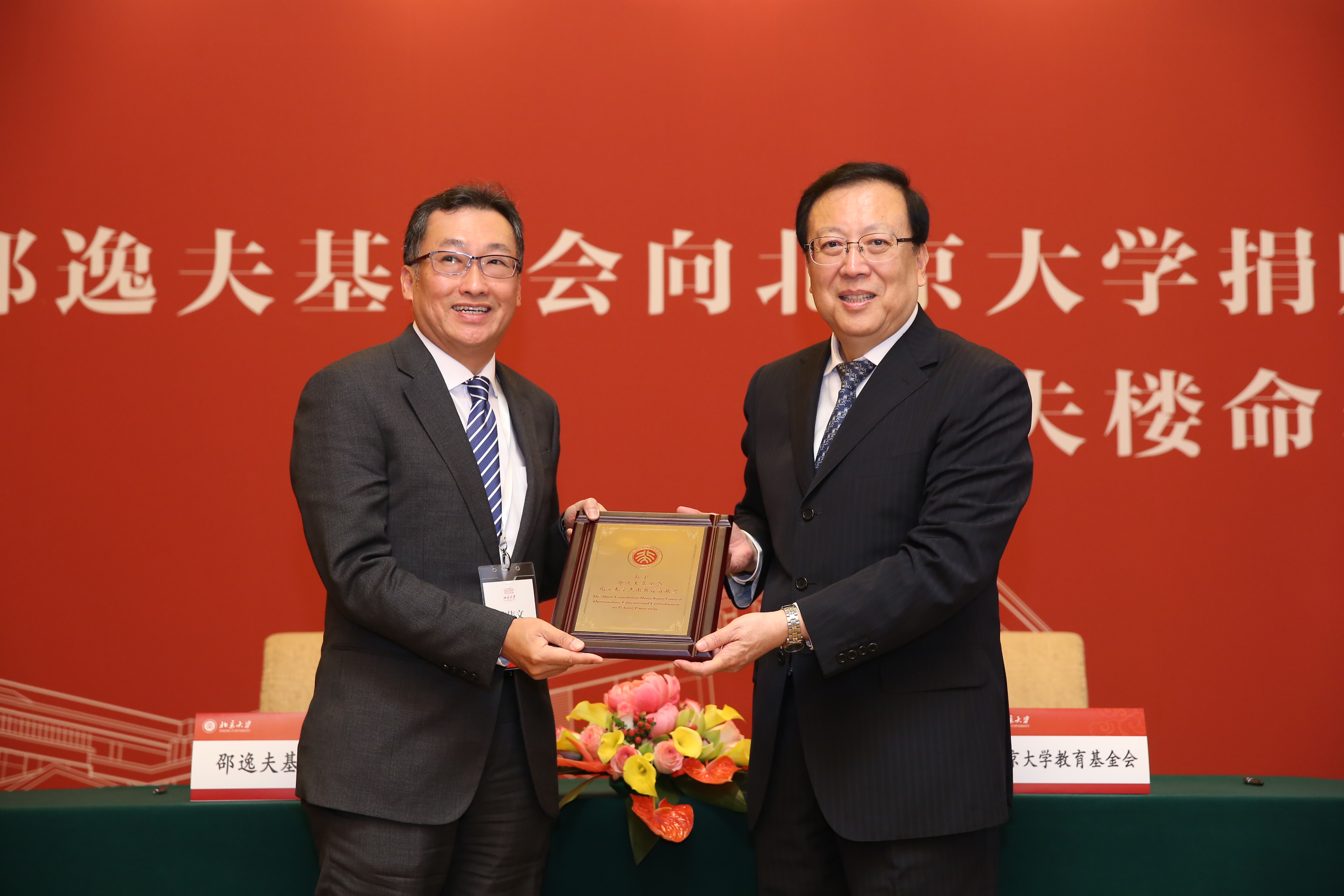在陳寶生部長等領(lǐng)導(dǎo)和嘉賓的見證下,陳偉文主席與郝平書記共同簽署捐贈(zèng)協(xié)議,并遞贈(zèng)支票。郝平書記代表北京大學(xué)向邵氏基金會(huì)頒授北京大學(xué)杰出教育貢獻(xiàn)獎(jiǎng),吳虹院長和謝曉亮教授分別贈(zèng)送紀(jì)念品。