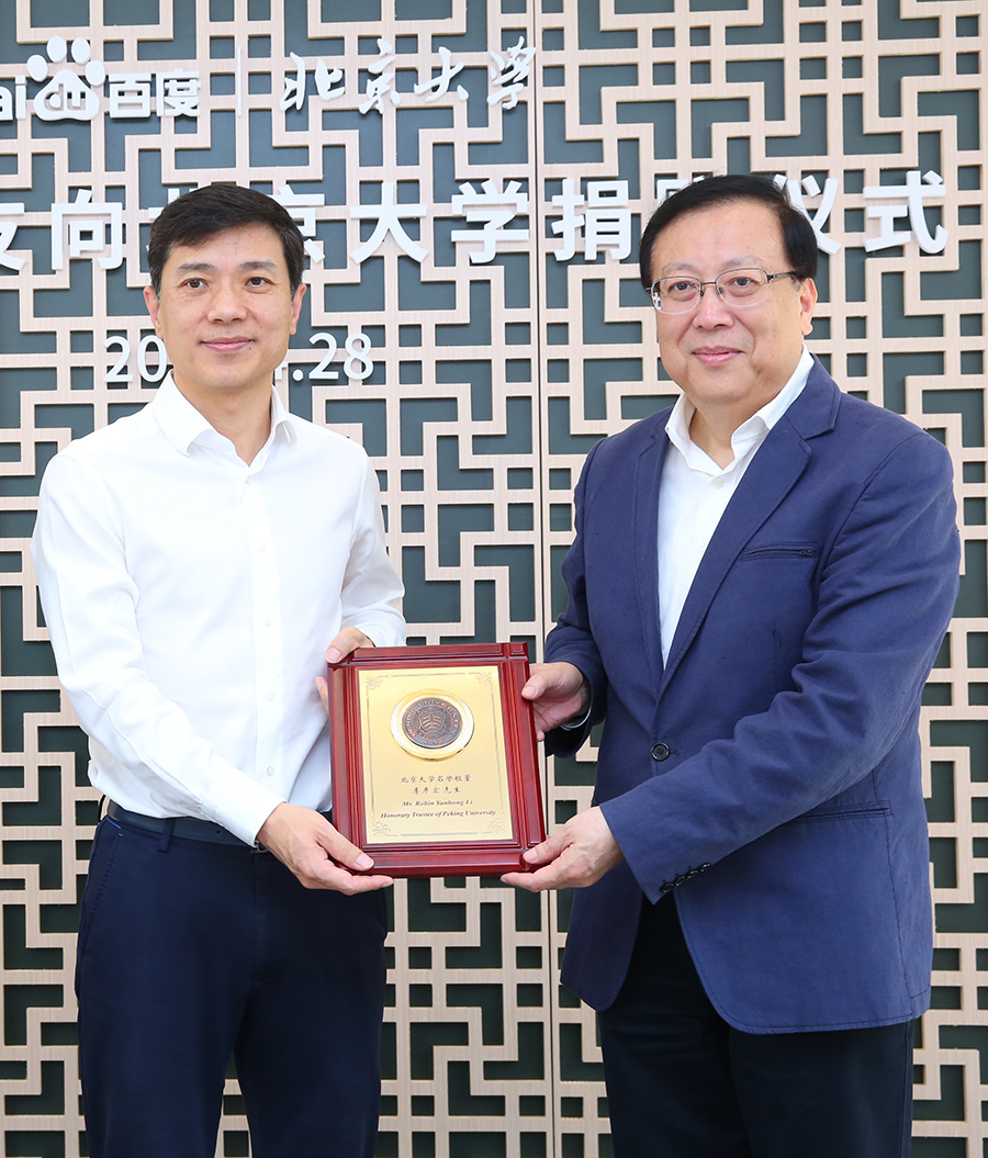 郝平書記、林建華校長向李彥宏校友、馬東敏博士頒授北京大學(xué)名譽(yù)校董銅牌