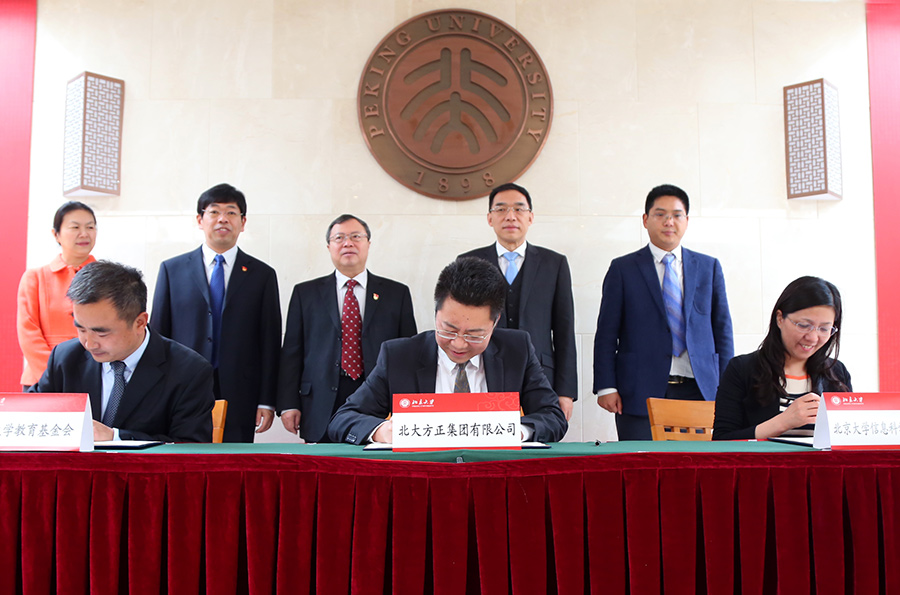 在全場熱烈的掌聲中,生玉海董事長、黃如院長和李宇寧秘書長共同簽署捐贈協(xié)議。王仰麟副校長向方正集團(tuán)頒發(fā)北京大學(xué)杰出教育貢獻(xiàn)獎(jiǎng)。