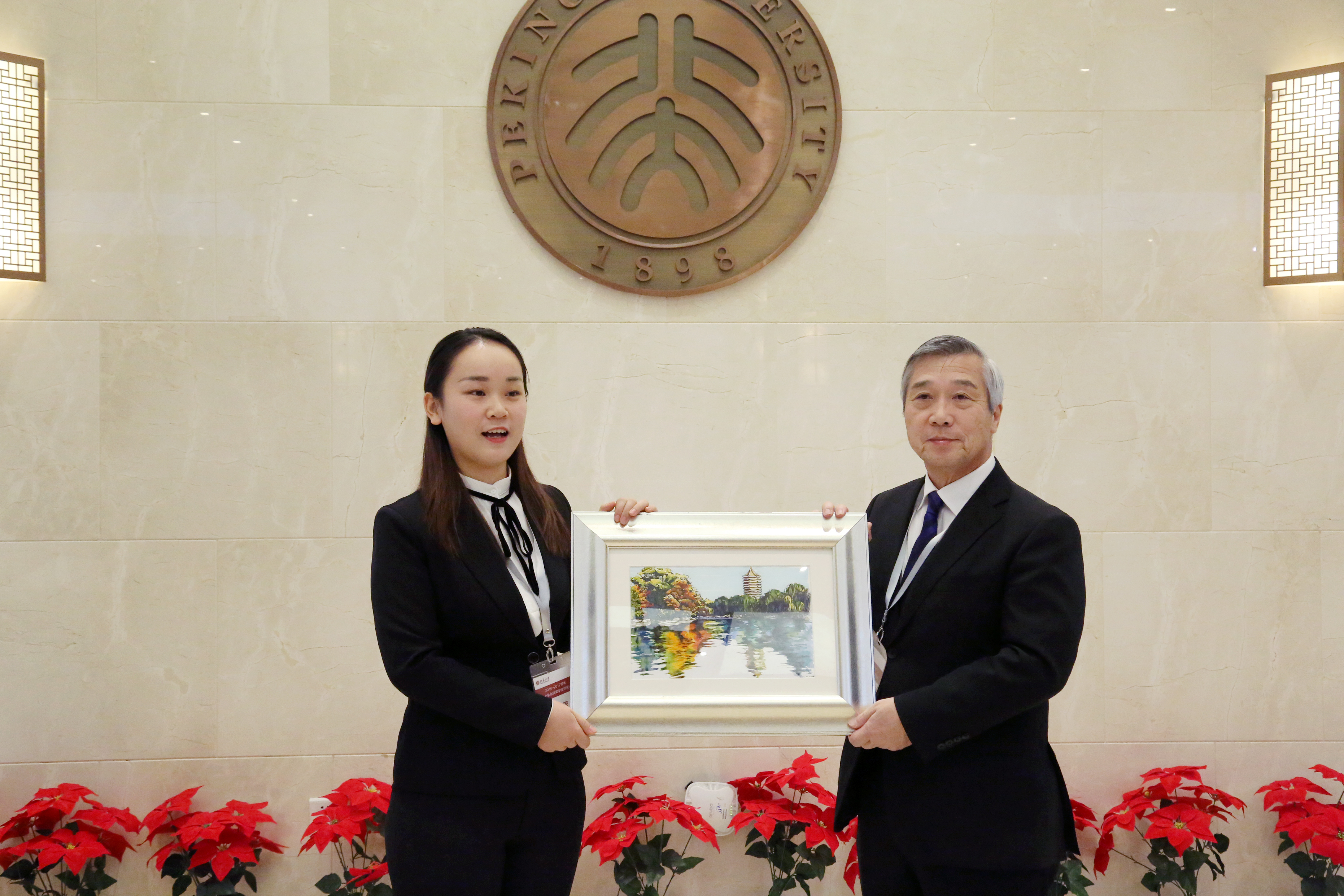 藝術(shù)學(xué)院2014級(jí)本科生黃露瑩代表全體獲獎(jiǎng)同學(xué)表達(dá)了對(duì)永旺集團(tuán)的感謝與敬意,她分享了在北大三年的求學(xué)生活,引用永旺宣言“永旺以寬廣的胸懷和富有活力的行動(dòng),使人生和生活的每一天都變成充滿希望的美好未來(lái)”表示,永旺精神將一直伴隨在獲獎(jiǎng)學(xué)生身邊,激勵(lì)他們“永遠(yuǎn)拼搏向上,永遠(yuǎn)富有活力”,不斷提升自我,為社會(huì)、國(guó)家、世界的未來(lái)發(fā)展做出貢獻(xiàn)。黃露瑩還代表全體獲獎(jiǎng)同學(xué)向橫尾博先生贈(zèng)送北大元素彩繪作品,以表達(dá)對(duì)永旺集團(tuán)的真誠(chéng)謝意。