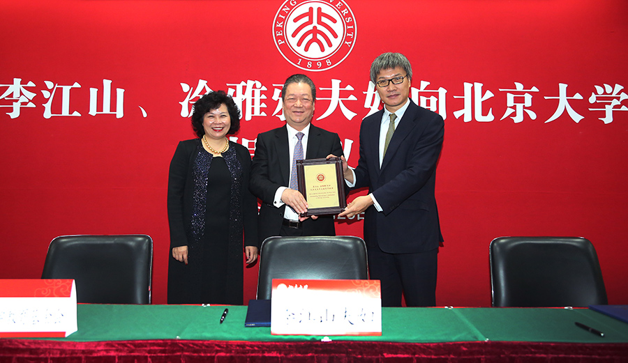 在全場熱烈的掌聲中,李江山先生、閻鳳橋書記、李宇寧秘書長共同簽署捐贈協(xié)議。王博副校長向李江山夫婦頒發(fā)北京大學杰出教育貢獻獎。閔維方教授向李江山夫婦贈送紀念品。(記者:王婷)