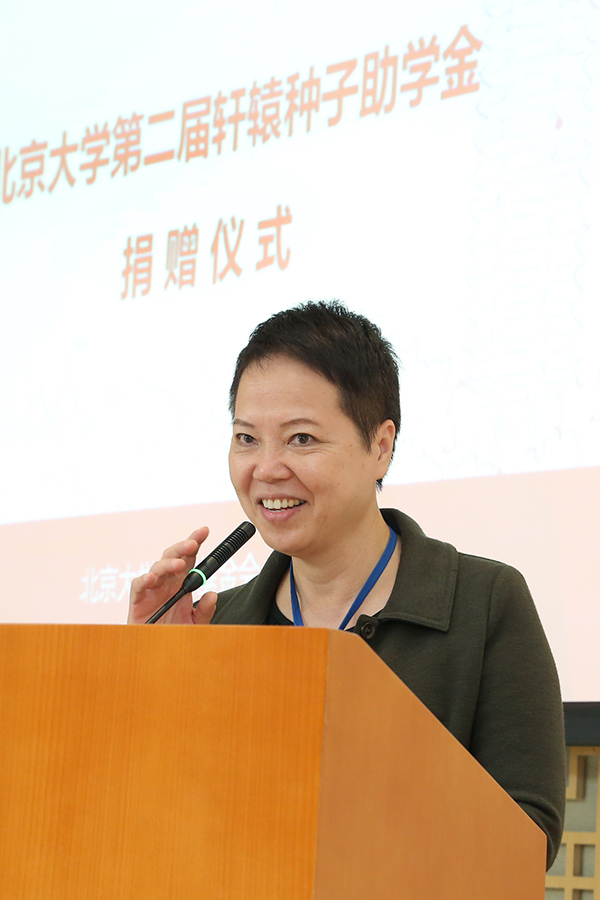 孔敏莊女士在致辭中表示,通過與受助學(xué)生的交流讓她看到了薪火相傳、愛心互助。她認(rèn)為軒轅教育基金會(huì)與北京大學(xué)的合作非常有意義、有價(jià)值。