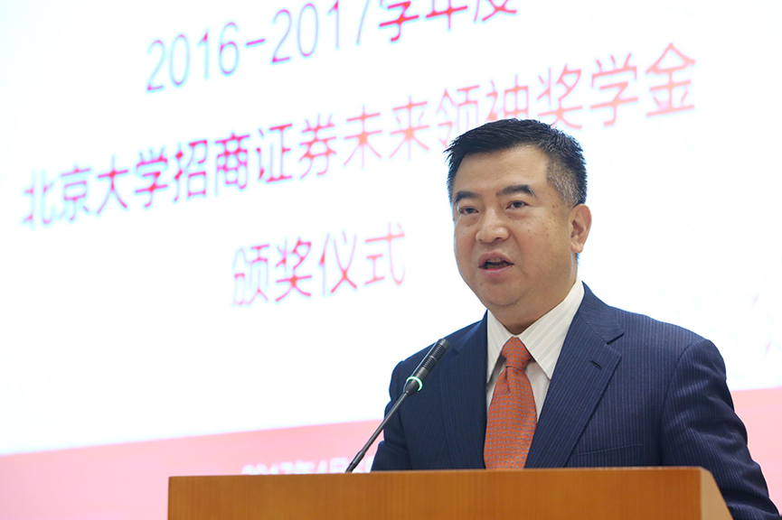 王巖總裁在致辭中回顧了未來領袖教育基金的設立和評審過程。他指出,中國夢引領新時代建設,新時代呼喚新的青年領袖,未來領袖基金因此而設,更將為此而努力。他強調這是招商證券在社會公益領域內一次有意義的探索,希望通過企業(yè)與學校的強強聯(lián)合,優(yōu)勢互補,為社會培養(yǎng)出更多優(yōu)秀人才和領軍人物。王巖總裁表示,獎學金是對同學們成績的肯定,更代表嶄新的開端,蘊育著深厚期許。他希望北大優(yōu)秀學子能夠在孕育機遇和夢想的偉大時代勇于追夢、開拓創(chuàng)新、引領未來,也祝愿未來領袖基金能夠為社會孵化出更多優(yōu)秀青年領袖。