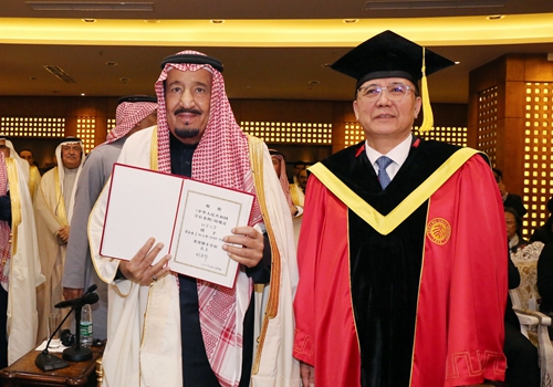 薩勒曼國(guó)王陛下是沙中友誼的親歷者、支持者和推動(dòng)者,此前曾兩度訪華,高度重視發(fā)展沙中兩國(guó)關(guān)系,并積極致力于加強(qiáng)與中國(guó)在各領(lǐng)域內(nèi)的合作,推動(dòng)雙邊關(guān)系深入發(fā)展。薩勒曼國(guó)王陛下在典禮上為北京大學(xué)分館落成揭幕。在隨后舉行的名譽(yù)博士學(xué)位授予儀式上,林建華校長(zhǎng)向國(guó)王陛下頒發(fā)了北京大學(xué)名譽(yù)博士學(xué)位證書。薩勒曼國(guó)王陛下表示,北京大學(xué)是中國(guó)傳播文化知識(shí)的中心,也即將迎來120周年校慶,很高興接受北京大學(xué)名譽(yù)博士學(xué)位稱號(hào),并希望北京大學(xué)分館成為沙中兩國(guó)的文化見證,為兩國(guó)開拓更廣闊的合作前景作出貢獻(xiàn)。