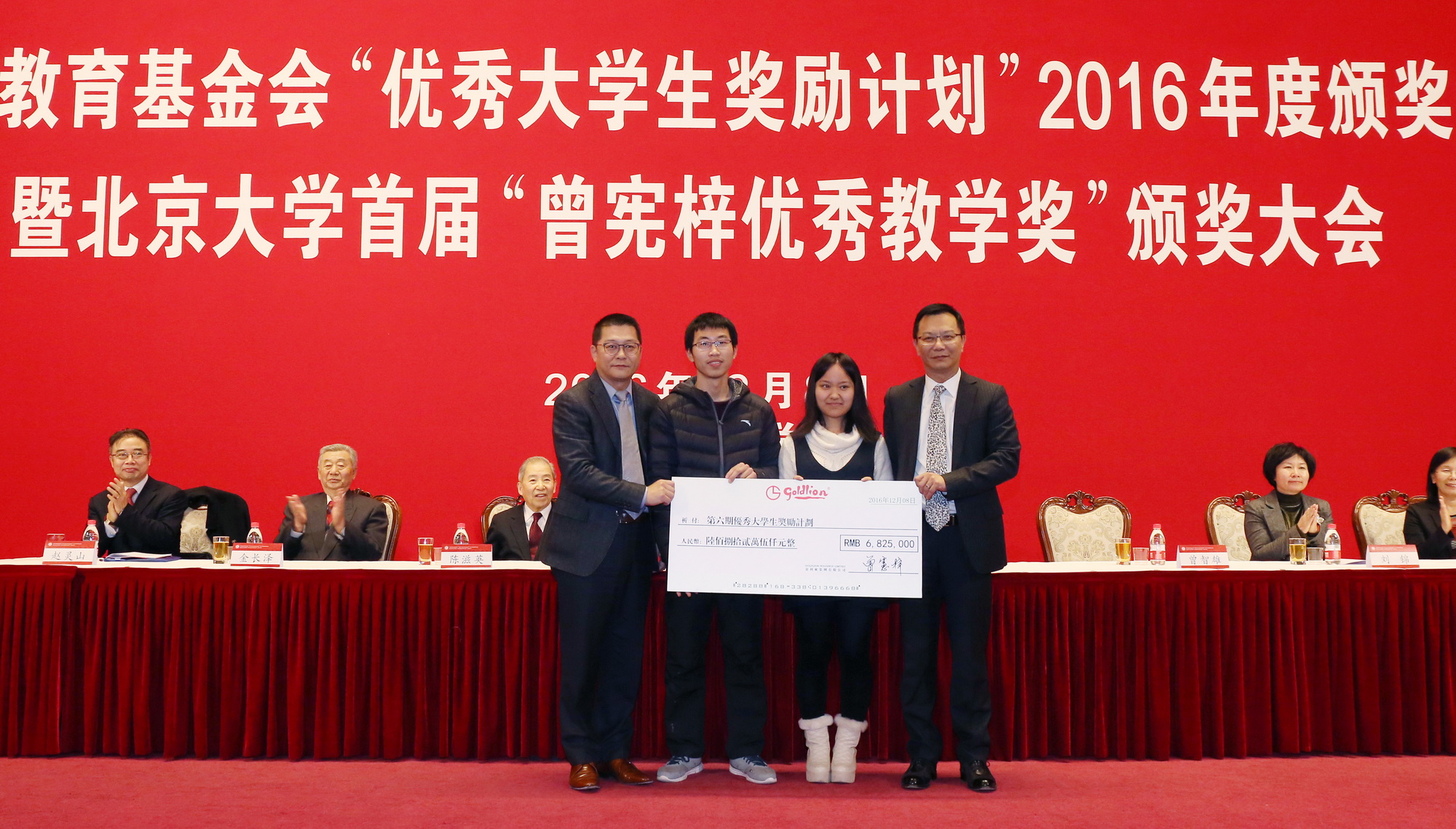 12月8日,曾憲梓教育基金會(huì)“優(yōu)秀大學(xué)生獎(jiǎng)勵(lì)計(jì)劃”2016年度頒獎(jiǎng)大會(huì)暨北京大學(xué)首屆“曾憲梓優(yōu)秀教學(xué)獎(jiǎng)”頒獎(jiǎng)大會(huì)在北京大學(xué)隆重舉行。來自內(nèi)地38所高校的1365名優(yōu)秀貧困大學(xué)生獲得總額近700萬元的獎(jiǎng)學(xué)金,同時(shí)頒發(fā)的還有北京大學(xué)曾憲梓優(yōu)秀教學(xué)獎(jiǎng),該獎(jiǎng)由曾憲梓先生捐資于2016年初設(shè)立,本年度首次評(píng)選,16位北大教師獲獎(jiǎng)。