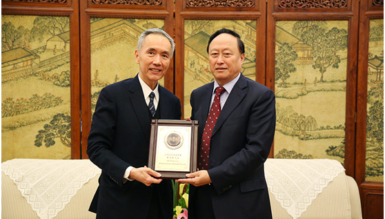 在會面中,朱書記向黃志祥先生頒授北京大學(xué)名譽(yù)校董銅牌,并頒發(fā)北京大學(xué)國際咨詢委員會委員聘書。學(xué)生代表為黃志祥校董佩戴北京大學(xué)校徽并獻(xiàn)花。