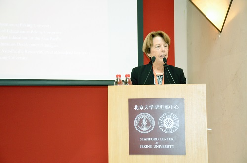 戴慕珍在致辭中對各位專家學者的到來表示熱烈的歡迎。她指出,在過去5年中,北京大學斯坦福中心不僅為斯坦福大學師生了解和研究中國提供了重要的支持,同時也為中美兩國乃至全球優(yōu)秀學者提供了學術(shù)交流平臺;建設(shè)世界一流大學已成為各國增強國家競爭力、發(fā)展高等教育的重要戰(zhàn)略,論壇為更加深入地探討這一問題提供了契機。戴慕珍感謝北京大學、北京大學教育學院對本屆論壇的支持,并預(yù)祝論壇圓滿成功。