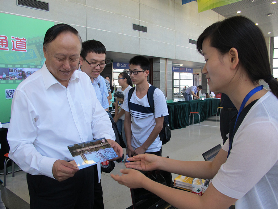 在迎新當(dāng)天,林建華校長(zhǎng)和朱善璐書記等校領(lǐng)導(dǎo)先后來到綠色通道,親切看望學(xué)生并慰問工作人員。在基金會(huì)的迎新站點(diǎn),林校長(zhǎng)詳細(xì)詢問了由基金會(huì)出資提供的愛心讀書卡的具體用途、使用方式,并對(duì)基金會(huì)連續(xù)多年的新生資助工作表示贊賞。朱書記向工作人員了解了讀書卡的發(fā)放對(duì)象,認(rèn)真查看名單并詢問發(fā)放的數(shù)量和情況。與工作人員一一握手后,朱書記笑著說:“我就是基金會(huì)的一員,我應(yīng)該站到這里服務(wù)。”他還鼓勵(lì)基金會(huì)要把這項(xiàng)工作持續(xù)下去,并做得更好。葉靜漪副書記來到綠色通道時(shí)親自為曾濤濤同學(xué)發(fā)放讀書卡,并表示學(xué)校會(huì)提供各種保障工作,勉勵(lì)他好好學(xué)習(xí)。