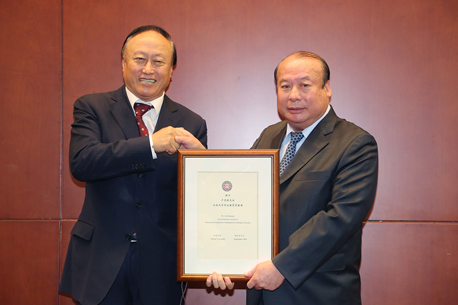 朱善璐書(shū)記向盧志強(qiáng)董事長(zhǎng)頒發(fā)北京大學(xué)杰出教育貢獻(xiàn)獎(jiǎng)