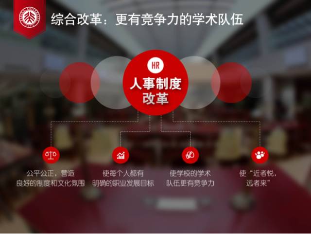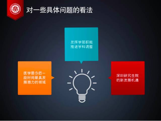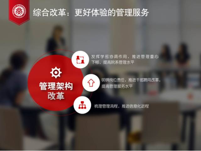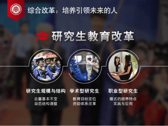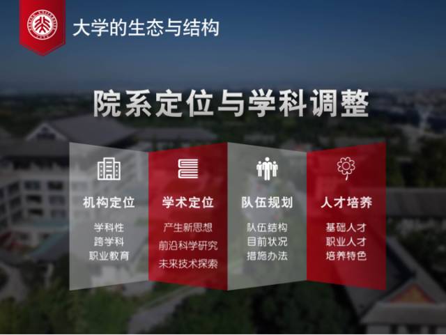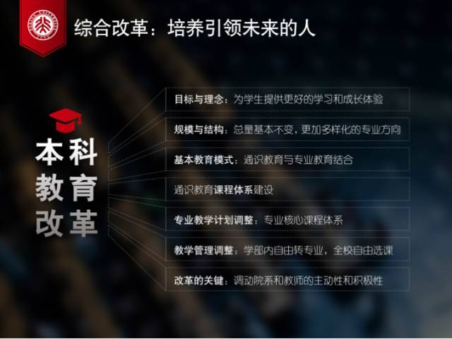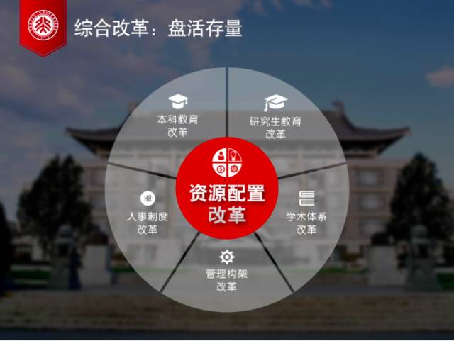 他指出,北大要變得更好,就需要我們不僅關注增量,更要盤活存量。北大盤活存量的解決手段是綜合改革,具體分為本科生和研究生教育改革、人事制度改革、學術體系改革、管理構架改革,以達到培養(yǎng)引領未來的人、建設更有競爭力的學術隊伍、建立更合理的學科布局等目標。