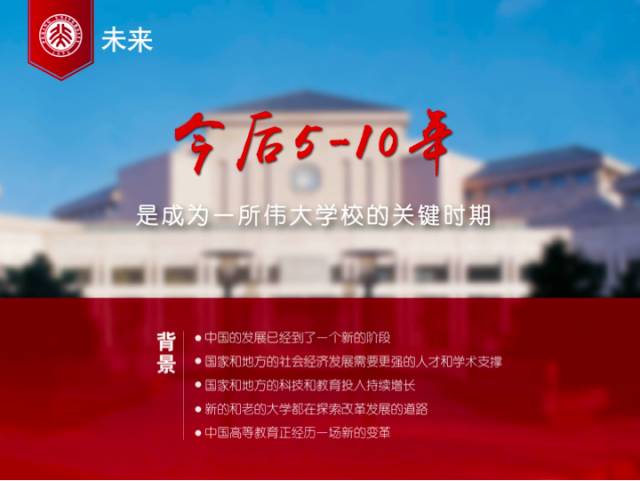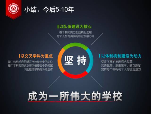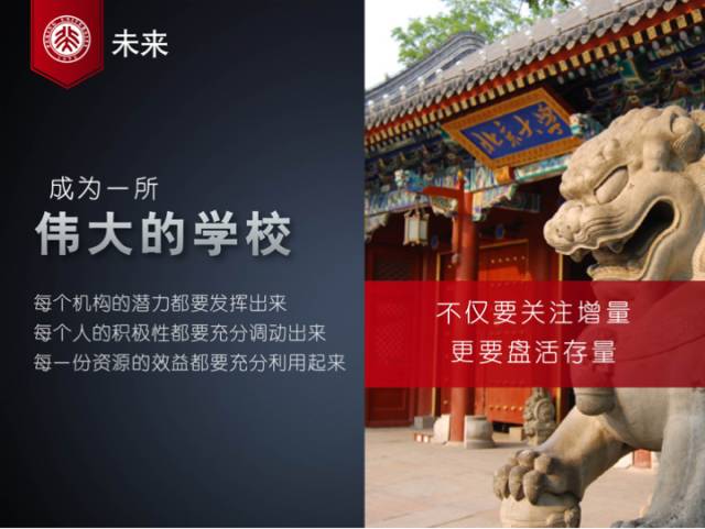 林建華校長認為,目前我們國家和社會正處在發(fā)展的新階段,國家和地方的科技與教育投入空前,高等教育正在面臨著一場全新的變革。基于這樣的時代背景,他提出,今后5-10年是北大成為一所偉大學校的關鍵時期。一所偉大的學校,應該已經(jīng)和正在為民族和人類做出杰出貢獻,應該培養(yǎng)引領未來的人,應該產(chǎn)生推動國家和人類進步的新思想、前沿科學、未來技術。成為一所偉大的學校,需要發(fā)揮每個機構的潛力,調(diào)動每個人的積極性,充分利用每一分資源的效益。