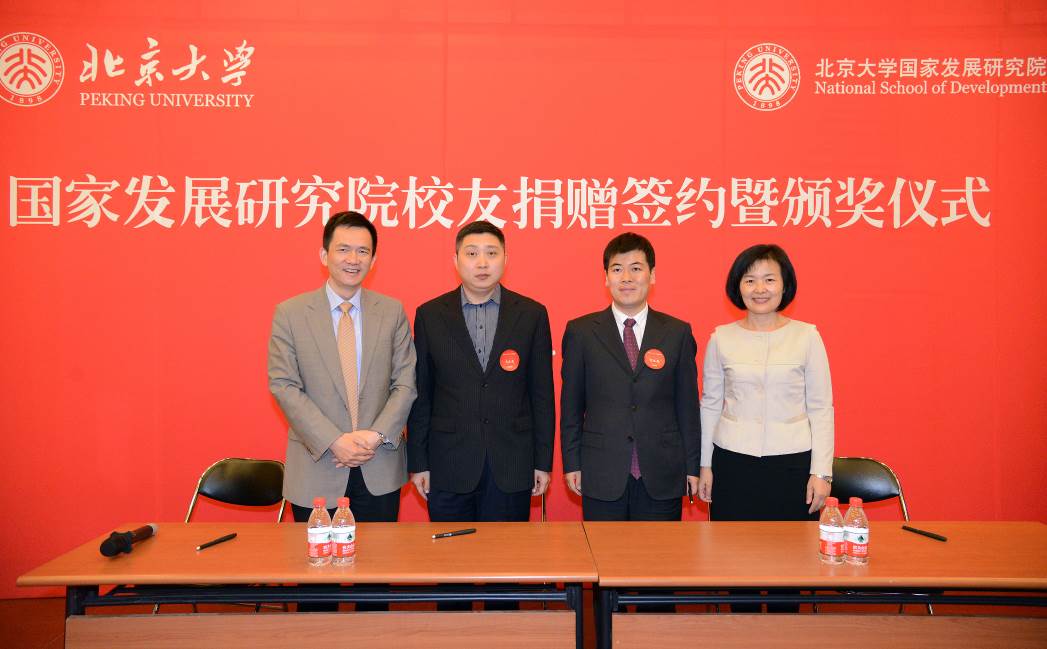 姚洋院長(zhǎng)、鄧婭校長(zhǎng)助理與馬慶偉、何永利校友共同簽署捐贈(zèng)協(xié)議