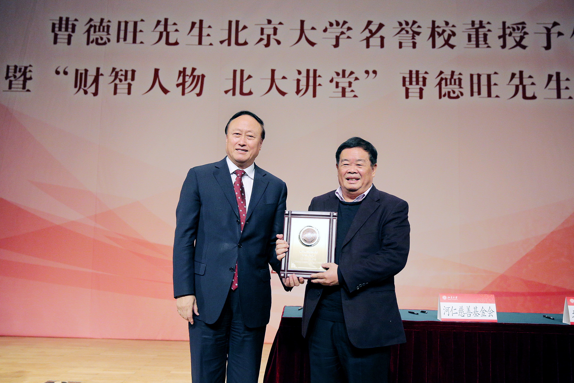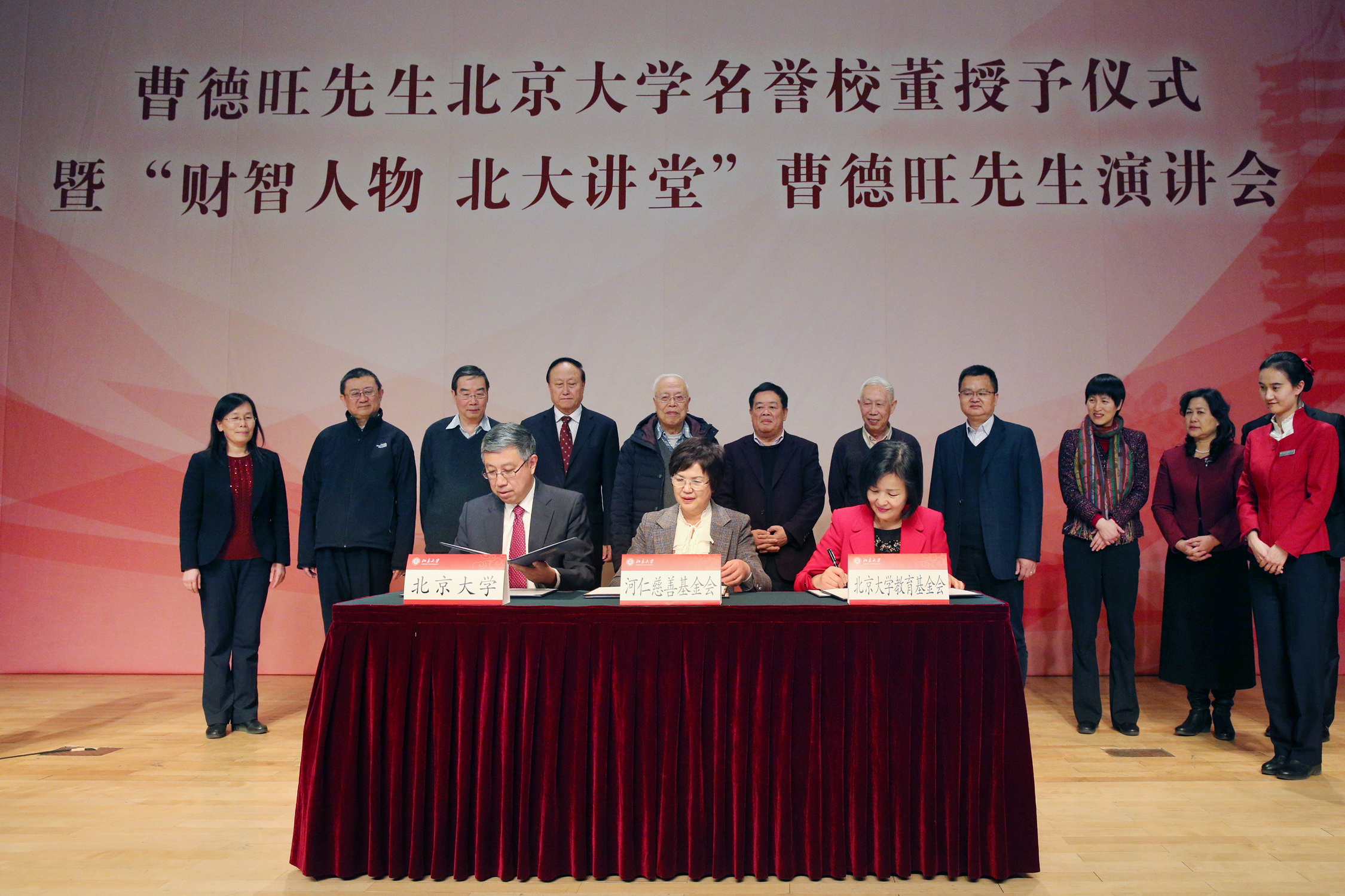 3月11日,春回燕園,曹德旺先生北京大學(xué)名譽(yù)校董授予儀式暨“財(cái)智人物北大講堂”演講會(huì)在北京大學(xué)百周年紀(jì)念講堂多功能廳隆重舉行。河仁慈善基金會(huì)發(fā)起人、福耀集團(tuán)董事長(zhǎng)曹德旺先生,河仁慈善基金會(huì)秘書(shū)長(zhǎng)林瑞華女士一行蒞臨北京大學(xué),與校黨委書(shū)記朱善璐,副校長(zhǎng)王杰,數(shù)學(xué)科學(xué)學(xué)院院長(zhǎng)田剛院士,副教務(wù)長(zhǎng)、學(xué)科建設(shè)辦公室主任、數(shù)學(xué)科學(xué)學(xué)院黨委書(shū)記張平文院士,數(shù)學(xué)科學(xué)學(xué)院姜伯駒院士、張恭慶院士、文蘭院士,校長(zhǎng)助理、教育基金會(huì)秘書(shū)長(zhǎng)鄧婭,校長(zhǎng)助理、工會(huì)主席孫麗等師生代表共同見(jiàn)證了儀式。儀式由黨委副書(shū)記葉靜漪主持。