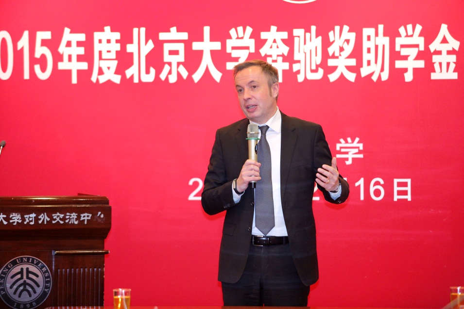 12月16日,北京大學(xué)奔馳獎助學(xué)金學(xué)生交流會在英杰交流中心舉行。戴姆勒大中華區(qū)投資有限公司人力資源執(zhí)行副總裁華德瑞、對外事務(wù)執(zhí)行副總裁李潔、人力資源雇主品牌及招聘負(fù)責(zé)人林艷、北京大學(xué)校長助理、教育基金會秘書長鄧婭、學(xué)生資助中心主任楊愛民、學(xué)生就業(yè)指導(dǎo)中心主任陳永利、學(xué)生工作部副部長劉德英,以及獲獎助學(xué)生代表共同出席。奔馳獎學(xué)金獲獎學(xué)生、2012級中國語言文學(xué)系王蕊和2014級光華管理學(xué)院林心悅主持交流會。