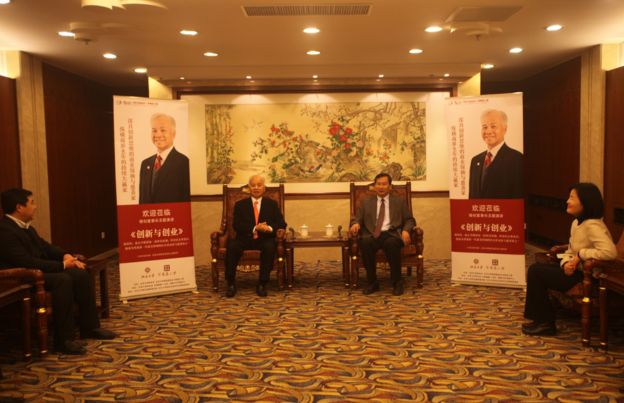 演講開始前,北京大學(xué)校務(wù)委員會(huì)副主任饒毅教授會(huì)見了楊釗先生一行。校長助理、教育基金會(huì)秘書長鄧婭參與會(huì)見,并出席演講會(huì)。