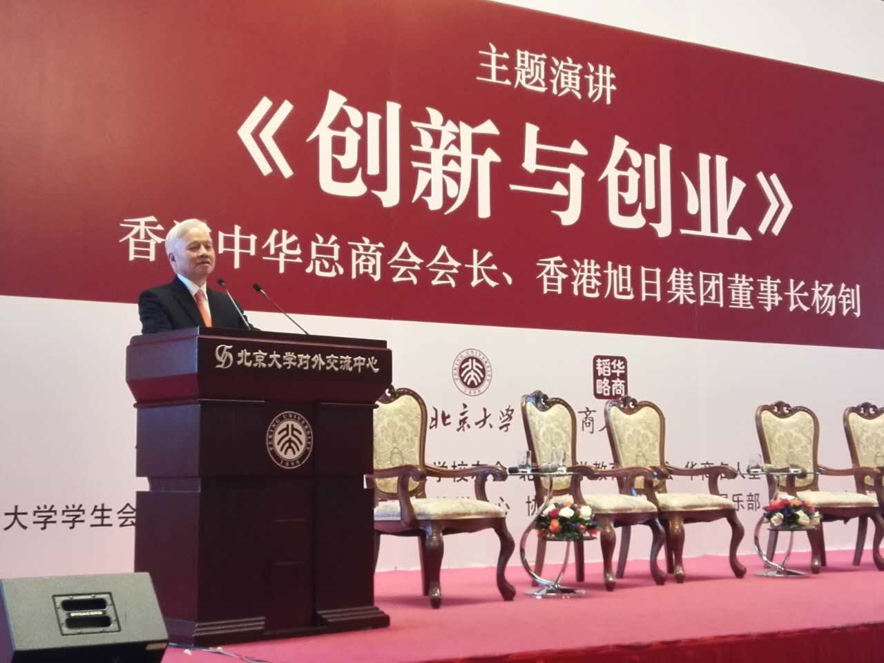 11月15日,香港中華總商會(huì)會(huì)長、旭日集團(tuán)董事長楊釗在北京大學(xué)“PKU Speech|華商名人堂”發(fā)表“創(chuàng)新與創(chuàng)業(yè)”主題演講。作為香港著名企業(yè)家、慈善家,楊釗先生分享了自己40多年商旅歷程中最核心的經(jīng)驗(yàn)與體會(huì),并與青年代表及北大學(xué)子進(jìn)行現(xiàn)場交流,帶來了一堂接地氣、非常實(shí)用的創(chuàng)業(yè)課。