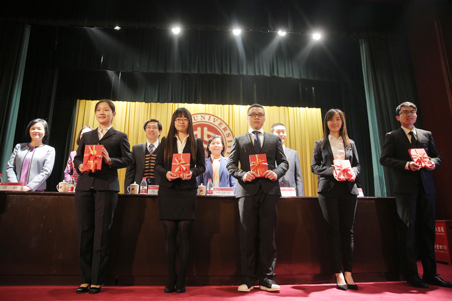 在頒獎儀式上,研究生院副院長、醫(yī)學部副主任段麗萍代表北京大學學生獎學金評審委員會介紹了2014-2015學年度光華獎學金的評審情況。陳振川執(zhí)行長、葉靜漪副書記、劉培林校友、段麗萍副院長和張慶東部長向獲獎學生代表頒發(fā)了獲獎證書。