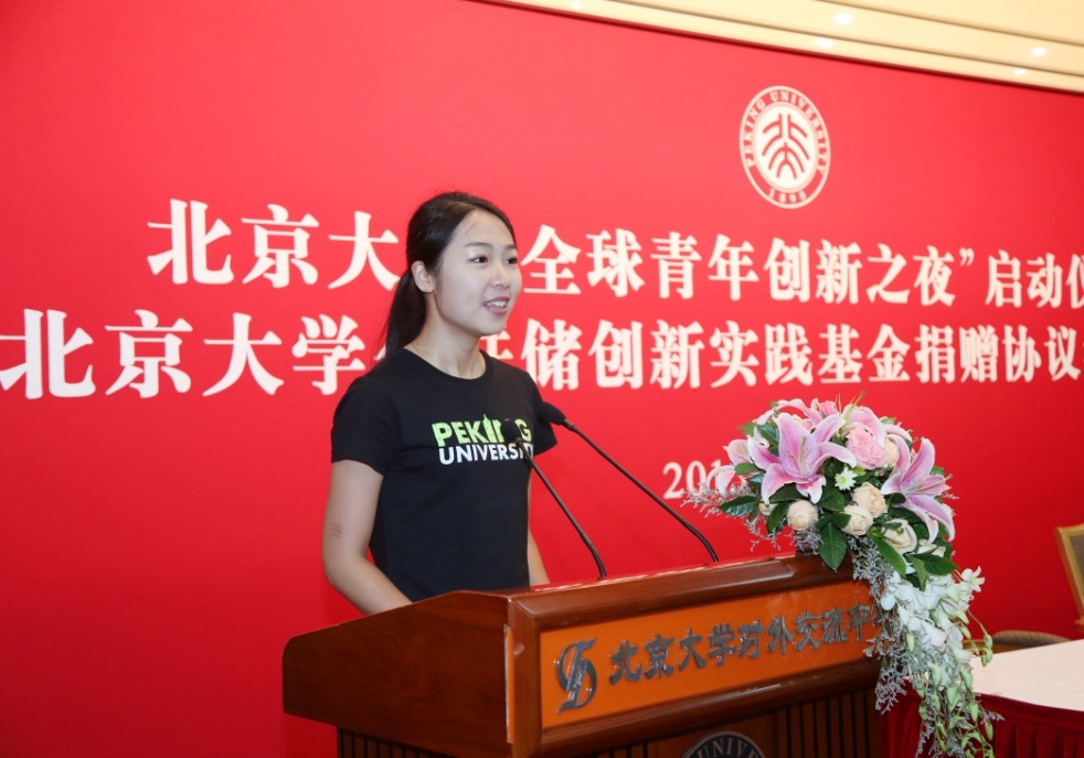 新聞與傳播學(xué)院12級本科生陳沫作為學(xué)生代表發(fā)言。從初中就開始創(chuàng)業(yè)的陳沫有很多感悟。她介紹了北大校內(nèi)創(chuàng)業(yè)的現(xiàn)狀:同學(xué)們的熱情很高,但由于缺少良好的平臺等原因,創(chuàng)業(yè)成功率并不高。她借此對“好師兄”王宇宏校友表達了感激之情,感謝他捐資支持“全球青年創(chuàng)新之夜”這個重要的創(chuàng)新創(chuàng)業(yè)平臺,并期望自己若有一天創(chuàng)業(yè)成功,也能有機會像王宇宏校友一樣回饋母校。