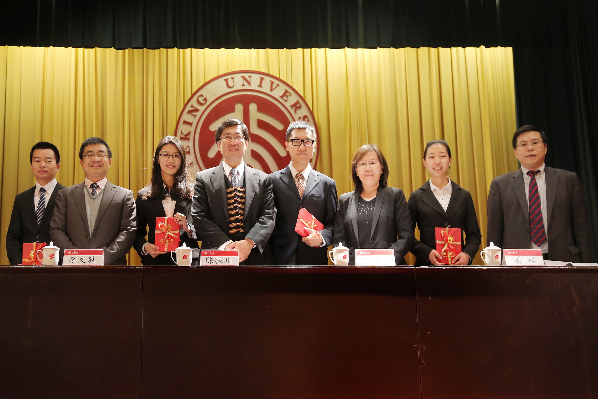 隨后在辦公樓禮堂舉行了2013-2014學(xué)年度北京大學(xué)光華獎學(xué)金頒獎儀式。醫(yī)學(xué)部黨委副書記李文勝代表北京大學(xué)學(xué)生獎學(xué)金評審委員會介紹了2013-2014學(xué)年度光華獎學(xué)金的評審情況。陳振川執(zhí)行長、葉靜漪副書記、李文勝老師和北醫(yī)三院姜輝教授向獲獎學(xué)生代表頒發(fā)了獲獎證書。