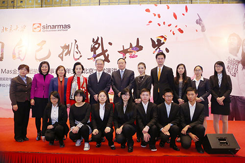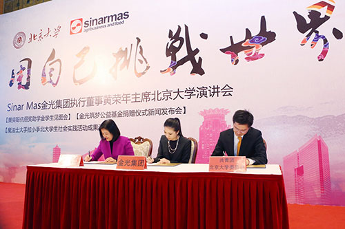 黃榮年先生的演講結(jié)束后,全場嘉賓觀看了一部名為《金光筑夢》的短片,講述了2014年暑期,北大學子在金光集團資助下,開展“魔法士大手拉小手下鄉(xiāng)公益行”活動的情況。來自法學院的周旭明同學代表實踐團隊成員匯報了同學們深入貧困地區(qū)的所見所聞所感。為更好地開展這項公益活動,金光集團農(nóng)業(yè)食品部執(zhí)行總裁黃雪婷、北京大學校長助理、教育基金會秘書長鄧婭和團委書記阮草共同簽署捐資協(xié)議,在北京大學設立“金光筑夢基金”,支持青年同學深入邊遠貧困地區(qū),傳遞愛心與責任,幫扶弱勢群體,為邊遠貧困地區(qū)帶來有益改變。在充滿暖意和微笑的掌聲中,北京大學2014年黃奕聰伉儷獎助學金頒獎典禮暨“金光筑夢”基金簽約儀式圓滿結(jié)束。