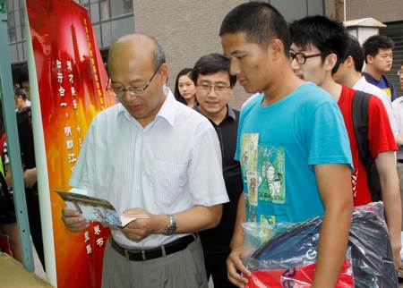 王恩哥校長與來自河南的數(shù)學(xué)學(xué)院新生王慶華一起看讀書卡封面的信,并向他贈送讀書卡