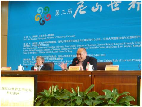 除了在論壇大會(huì)的發(fā)言,廖凱原教授與徐炳教授還參加了“與會(huì)學(xué)者院部講座”活動(dòng),在山東大學(xué)法學(xué)院作了報(bào)告。以“中國夢就是軒轅大同”為題,廖凱原教授回顧歷史,高度肯定了軒轅黃帝的偉大的歷史功績。他總結(jié)中國夢為“根據(jù)每個(gè)人的夢想和愿望,以其為始,以其為終”,表示我們前所未有地接近中國夢這一夢想。廖凱原教授對中國法治及義理的發(fā)展和在現(xiàn)代社會(huì)中的運(yùn)用方面進(jìn)行了詳解,認(rèn)為中國五千年的持續(xù)文明擁有來自于軒轅之“道”獨(dú)特的科學(xué)觀法治及義理之治。他歸納了軒轅文化的三個(gè)特點(diǎn),并闡述了一種嶄新的生存范式人生而自由,有無往不在而自由地生活,擺脫枷鎖,我們終將自由!最后,廖凱原教授在優(yōu)美的長笛伴奏聲中抑揚(yáng)頓挫的朗誦了詩歌《軒轅之大同》,深深的震撼了同學(xué)們的身心。