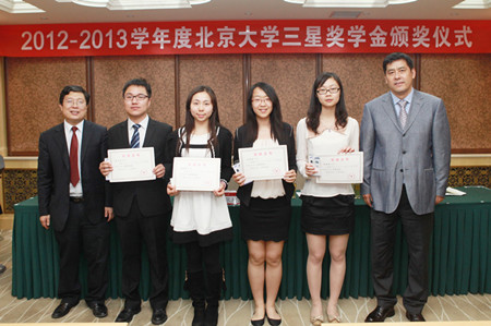 頒獎(jiǎng)儀式由趙文莉主持。儀式上,劉德英介紹了2012—2013學(xué)年度北京大學(xué)三星獎(jiǎng)學(xué)金的評(píng)審狀況并宣讀獲獎(jiǎng)學(xué)生名單。 2012-2013學(xué)年度三星獎(jiǎng)學(xué)金的評(píng)審工作嚴(yán)格按照三星集團(tuán)與北京大學(xué)簽訂的獎(jiǎng)學(xué)金協(xié)議及《北京大學(xué)學(xué)生獎(jiǎng)學(xué)金評(píng)審條例》的規(guī)定進(jìn)行。經(jīng)院系初評(píng)、公示、征求意見及校學(xué)生獎(jiǎng)學(xué)金評(píng)審委員會(huì)審議,2012—2013學(xué)年度北京大學(xué)共評(píng)出來自數(shù)學(xué)科學(xué)學(xué)院等7個(gè)院系的17名同學(xué)獲獎(jiǎng)。