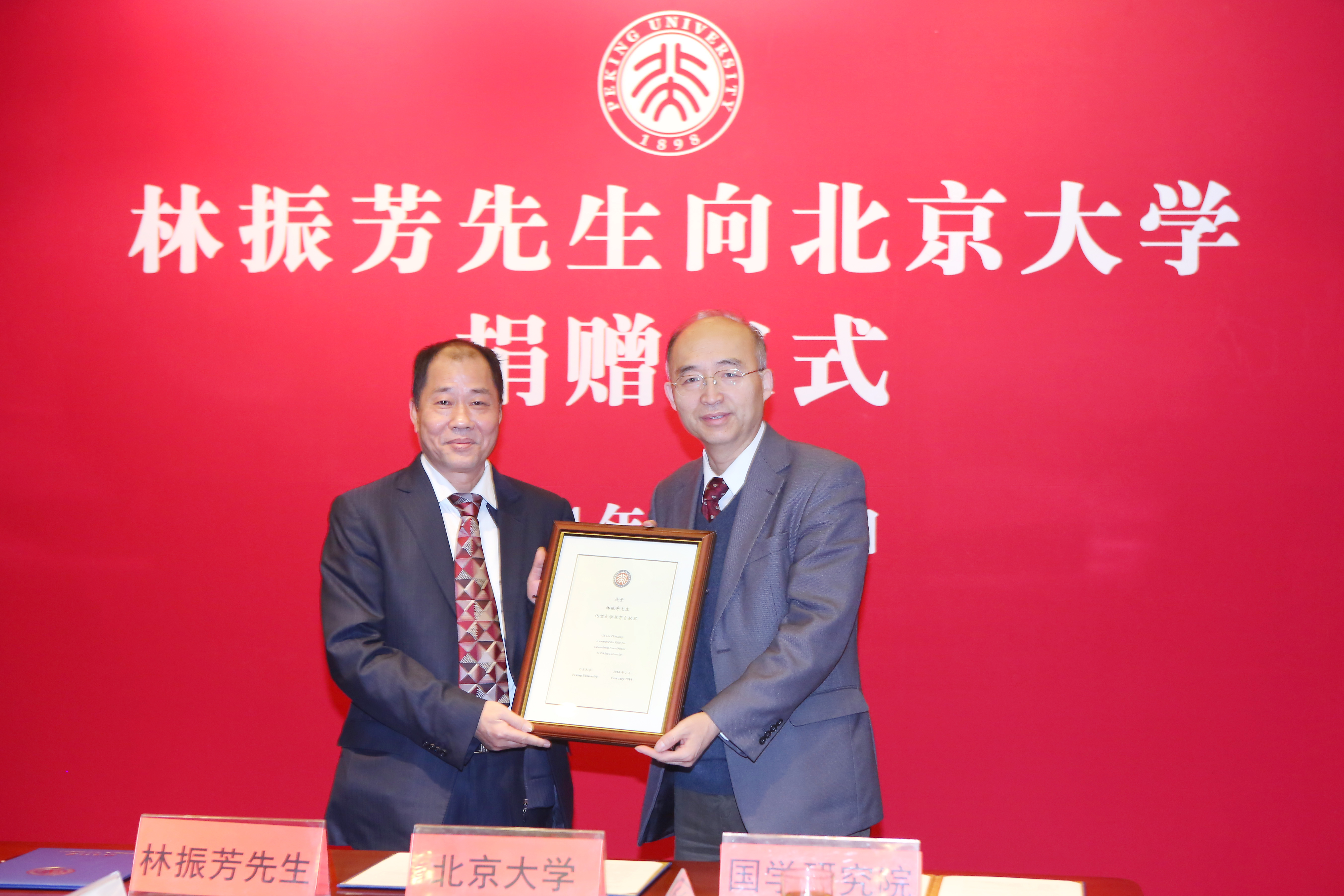 在熱烈的掌聲中,林振芳先生、吳志攀常務(wù)副校長(zhǎng)共同簽署了“北京大學(xué)林振芳獎(jiǎng)學(xué)金”捐贈(zèng)協(xié)議,并和袁行霈教授一起簽署了“袁行霈國(guó)學(xué)研究基金”捐贈(zèng)協(xié)議。根據(jù)協(xié)議,林振芳先生將捐資支持國(guó)學(xué)研究院開展博士生學(xué)術(shù)交流、國(guó)學(xué)研究刊物的出版等相關(guān)的教學(xué)科研和基礎(chǔ)設(shè)施的建設(shè),并且設(shè)立“林振芳獎(jiǎng)學(xué)金”,以獎(jiǎng)勵(lì)中文、歷史、哲學(xué)、考古專業(yè)的博士生。吳志攀常務(wù)副校長(zhǎng)和袁行霈教授分別向林振芳先生頒授“北京大學(xué)教育貢獻(xiàn)獎(jiǎng)”并贈(zèng)送紀(jì)念品。