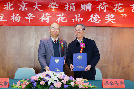 吳志攀與楊辛共同簽署了《荷花藝術(shù)品捐贈協(xié)議》和《“楊辛荷花品德獎”設(shè)立協(xié)議》。朱善璐代表學校向楊辛致贈“北京大學杰出教育貢獻獎”。