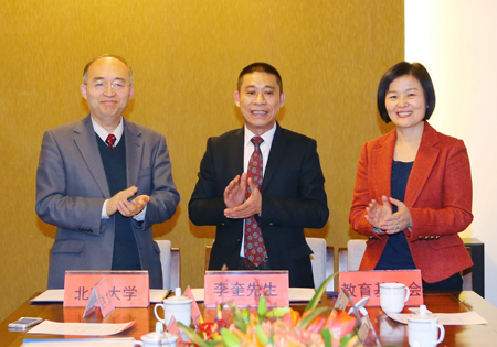 吳志攀常務(wù)副校長、李奎先生以及基金會(huì)秘書長鄧婭代表三方共同簽署了捐贈(zèng)協(xié)議。為表示感謝,吳志攀向基金捐贈(zèng)人李奎和基金發(fā)起人謝建華授予北京大學(xué)教育貢獻(xiàn)獎(jiǎng)。