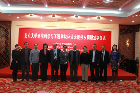 2013年12月23日上午,北京大學(xué)環(huán)境科學(xué)與工程學(xué)院在陳守仁國際會(huì)議中心舉行校友捐贈(zèng)環(huán)境大樓簽字儀式。北京大學(xué)常務(wù)副校長吳志攀,校長助理、教育基金會(huì)秘書長鄧婭,捐贈(zèng)校友梁萍、宋金鏈、北大應(yīng)用化學(xué)專業(yè)85級(jí)校友代表叢芳,以及環(huán)境科學(xué)與工程學(xué)院院長朱彤,副院長邵敏、王奇,黨委副書記劉卉等參加。院黨委書記胡建信主持捐贈(zèng)儀式。