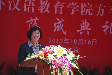 北京大學(xué)對外漢語教育學(xué)院院長張英隨后致辭。她首先對方李邦琴女士的知遇表達感激之情,并向?qū)ν鉂h語教育學(xué)院廣大師生深情地宣布“我們有家了”。對外漢語教育是北大的新興學(xué)科,負(fù)載著國家和民族發(fā)展的使命,承擔(dān)著北京大學(xué)建設(shè)國際一流大學(xué)的重任。她表示,對外漢語教育學(xué)院必將勇于擔(dān)當(dāng),堅持提高教學(xué)質(zhì)量、強化辦學(xué)特色、抓住機遇培養(yǎng)人才的發(fā)展目標(biāo),創(chuàng)出北大國際漢語教育品牌,為漢語和中華文化走向世界共同努力。