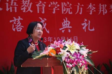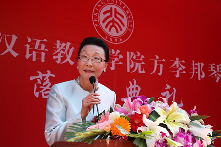 方李邦琴女士深情地表達了自己“驕傲、榮譽、快樂、興奮、激動”的心情。她說,這座大樓的落成,是對自己畢生情有獨鐘的教育事業(yè)一點貢獻,是推動中國文化走向世界的一個愿望,也是從小想做北大人的一個夢想,更是生命中實現(xiàn)中國夢的重要一環(huán)。方李邦琴女士認(rèn)為,21世紀(jì)國際化是不可抵擋的潮流,對外漢語教育學(xué)院是漢語國際化必經(jīng)的紐帶和平臺。“望出大樓的窗口,看到的是世界;踏入大樓的大門,走出的是全球。”她希望,學(xué)院能夠成就一批精通漢語、了解中國文化的國際學(xué)術(shù)人才,同時培養(yǎng)一批能夠通用漢語的國際專業(yè)人士,以區(qū)別于孔子學(xué)院“走出去”模式的“請進來”的方式,帶動漢語的普及化和實用化,促進中外交流合作。