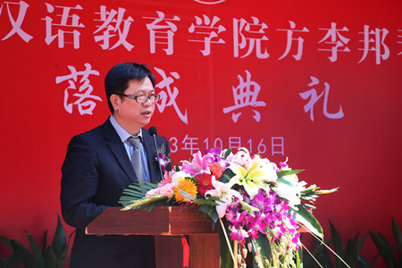 北京大學(xué)校長王恩哥首先致辭,對方李邦琴女士大力支持北大表示衷心感謝。他說,方李邦琴女士多年來為促進兩國友好往來、推進華文教育作出了重要貢獻,為北大建設(shè)付出了心血,是北大最親密的好朋友。正是在她的慷慨支持下,這座人文環(huán)境與自然環(huán)境和諧共生、現(xiàn)代建筑與傳統(tǒng)藝術(shù)相映成趣的大樓才得以建成。他在致辭中表示,學(xué)院大樓的建成將大力改善漢語教學(xué)條件,為漢語教學(xué)和國際推廣事業(yè)提供堅實的支撐。同時,對于北大加快創(chuàng)建世界一流大學(xué),推進國際化進程,進一步全方位推進漢語教學(xué)與文化交流具有重要意義。北大將秉持兼容并包、開放辦學(xué)的胸懷,繼續(xù)提高國際化辦學(xué)水平,為促進文化交流、構(gòu)建和諧世界作出新的貢獻。