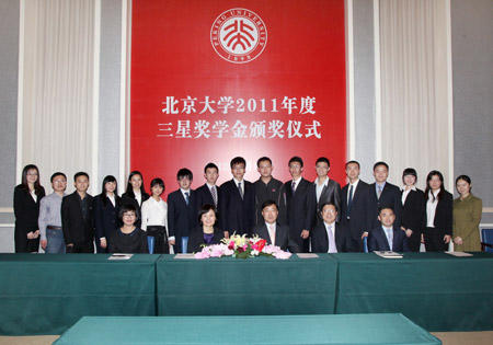 2012年4月16日,北京大學(xué)2011年度三星獎學(xué)金頒獎儀式在百周年紀(jì)念講堂202會議室舉行。大中華區(qū)三星集團(tuán)人力資源副總裁尹盛熙,三星電子中國總部人力資源經(jīng)理金玟洙,北京大學(xué)校長助理、教育基金會秘書長鄧婭,學(xué)生工作部部長張慶東,教育基金會副秘書長李榕及全體獲獎學(xué)生出席了頒獎儀式。活動由北京大學(xué)教育基金會副秘書長李榕主持。