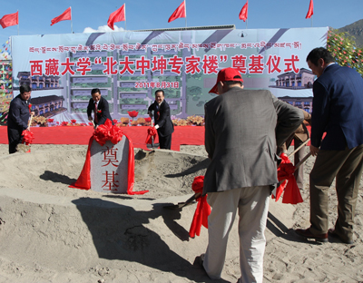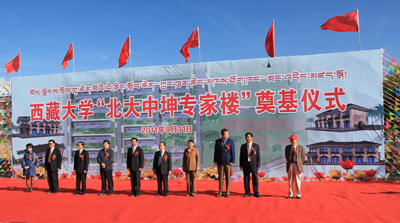 格桑盛開(kāi),雪頓飄香,在雪域高原美好的初秋時(shí)節(jié),2011年8月31日,由“北大-藏大對(duì)口支援基金”支持建設(shè)的“北大中坤專(zhuān)家樓”在西藏大學(xué)新校區(qū)隆重奠基。西藏自治區(qū)副主席丁業(yè)現(xiàn)、副秘書(shū)長(zhǎng)格桑玉珍、教育部高教司副司長(zhǎng)劉貴芹、西藏自治區(qū)教育廳廳長(zhǎng)宋和平等領(lǐng)導(dǎo)出席儀式。北京大學(xué)校長(zhǎng)周其鳳、常務(wù)副校長(zhǎng)吳志攀、校長(zhǎng)助理程旭以及來(lái)自研究生院、組織部、人事部、國(guó)內(nèi)合作部、校友會(huì)、基金會(huì)等部門(mén)的領(lǐng)導(dǎo),西藏大學(xué)黨委書(shū)記房靈敏、校長(zhǎng)格桑群培,“北大-藏大對(duì)口支援基金”設(shè)立者、中坤集團(tuán)董事長(zhǎng)黃怒波以及藏大百余名師生代表共同參加活動(dòng)。儀式由北京大學(xué)援藏干部、現(xiàn)任西藏大學(xué)副校長(zhǎng)陳建龍主持。