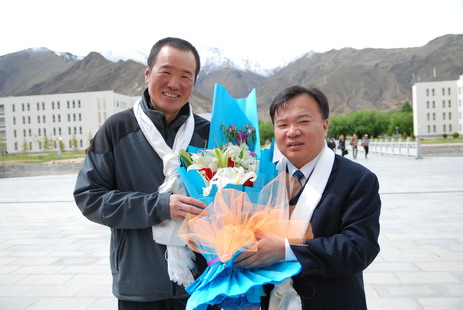 2011年5月20日凌晨5點(diǎn)10分,北京大學(xué)杰出校友、著名詩人企業(yè)家、中坤集團(tuán)董事長(zhǎng)黃怒波校友克服艱險(xiǎn),自珠穆朗瑪峰北坡成功登頂。在珠峰破曉前的黑暗中,他第二次將北京大學(xué)的旗幟展開在世界之巔。為了迎接黃怒波校友凱旋,北京大學(xué)黨委副書記、副校長(zhǎng)張彥代表母校親自趕至拉薩,向他送上最誠(chéng)摯的祝賀。