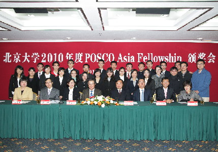 ?? ?2010年10月27日下午,北京大學(xué)2010年度POSCO Asia Fellowship獎學(xué)金頒獎會在英杰交流中心第二會議室舉行。POSCO青巖財團(tuán)常任副理事長崔光雄、浦項中國投資有限公司(POSCO-China)社長鄭吉洙、浦項中國投資有限公司對外協(xié)力部長孫正烈以及北京大學(xué)黨委副書記張彥、教育基金會副秘書長趙文莉、學(xué)生工作部副部長查晶等出席會議并為獲得2010年度POSCO獎學(xué)金的學(xué)生頒獎。