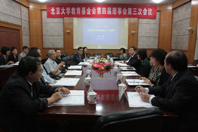 2009年9月19日上午,北京大學(xué)教育基金會(huì)第四屆理事會(huì)第三次會(huì)議在校長(zhǎng)辦公樓103會(huì)議室召開(kāi)。北京大學(xué)黨委書記、基金會(huì)理事長(zhǎng)閔維方、北京大學(xué)校長(zhǎng)周其鳳、基金會(huì)名譽(yù)理事長(zhǎng)許智宏、北大常務(wù)副校長(zhǎng)柯楊、代理副校長(zhǎng)廖陶琴、校長(zhǎng)助理李巖松、北大副總會(huì)計(jì)師閆敏、研究生院常務(wù)副院長(zhǎng)王仰麟、工學(xué)院院長(zhǎng)陳十一、醫(yī)學(xué)部副主任李鷹、教育基金會(huì)秘書長(zhǎng)鄧婭,以及私人投資家林君明、中南美洲國(guó)泰銀行董事長(zhǎng)黃紹文、中坤集團(tuán)董事長(zhǎng)黃怒波、中銀國(guó)際控股有限公司首席執(zhí)行官王巖等基金會(huì)理事出席會(huì)議。會(huì)議由閔維方理事長(zhǎng)主持。
