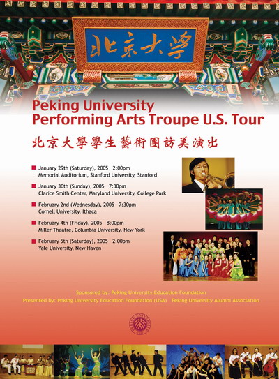 2005年1月27日,北大校長(zhǎng)許智宏院士將率領(lǐng)北京大學(xué)學(xué)生藝術(shù)團(tuán)赴美訪問,在美國斯坦福大學(xué)、馬里蘭大學(xué)、康奈爾大學(xué)、哥倫比亞大學(xué)、耶魯大學(xué)進(jìn)行為期12天的巡演。1月29日下午,在能容納1700人的斯坦福大學(xué)的紀(jì)念劇場(chǎng)Memorial Auditorium,北京大學(xué)學(xué)生藝術(shù)團(tuán)將以富有民族特色的精品節(jié)目——漢族舞蹈《放風(fēng)箏》拉開“北京大學(xué)學(xué)生藝術(shù)團(tuán)訪美演出”的序幕。